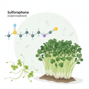 Sulforaphane is a potent isothiocyanate compound formed when the enzyme myrosinase (present in broccoli sprouts and other cruciferous vegetables) hydrolyzes glucoraphanin — a glucosinolate abundant in broccoli, especially young sprouts. Gram-for-gram, 3-day-old broccoli sprouts contain 10–100 times more glucoraphanin than mature broccoli florets, making them one of the richest natural sources of sulforaphane.